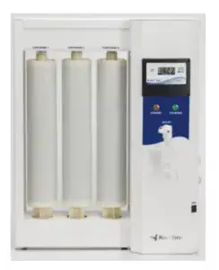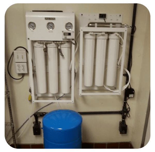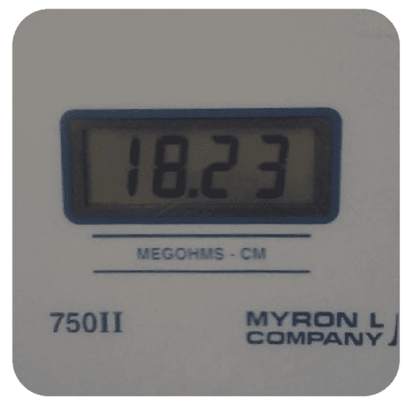 When there is demand for ultra-pure deionized (DI) water, the RO water is automatically dispensed from the storage tank and travels through a bank of mixed bed resin DI cartridges receiving a final polish. RO-DI systems can produce water up to the maximum possible purity of 18.2 meg ohm.