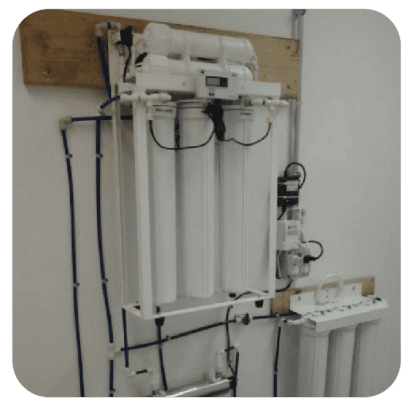 Pure Water Technology builds wall mount high purity laboratory systems. These compact systems employ reverse osmosis (RO) as pretreatment to purify tap water to 98% pure. The reverse osmosis water is then stored in a pressurized holding tank.